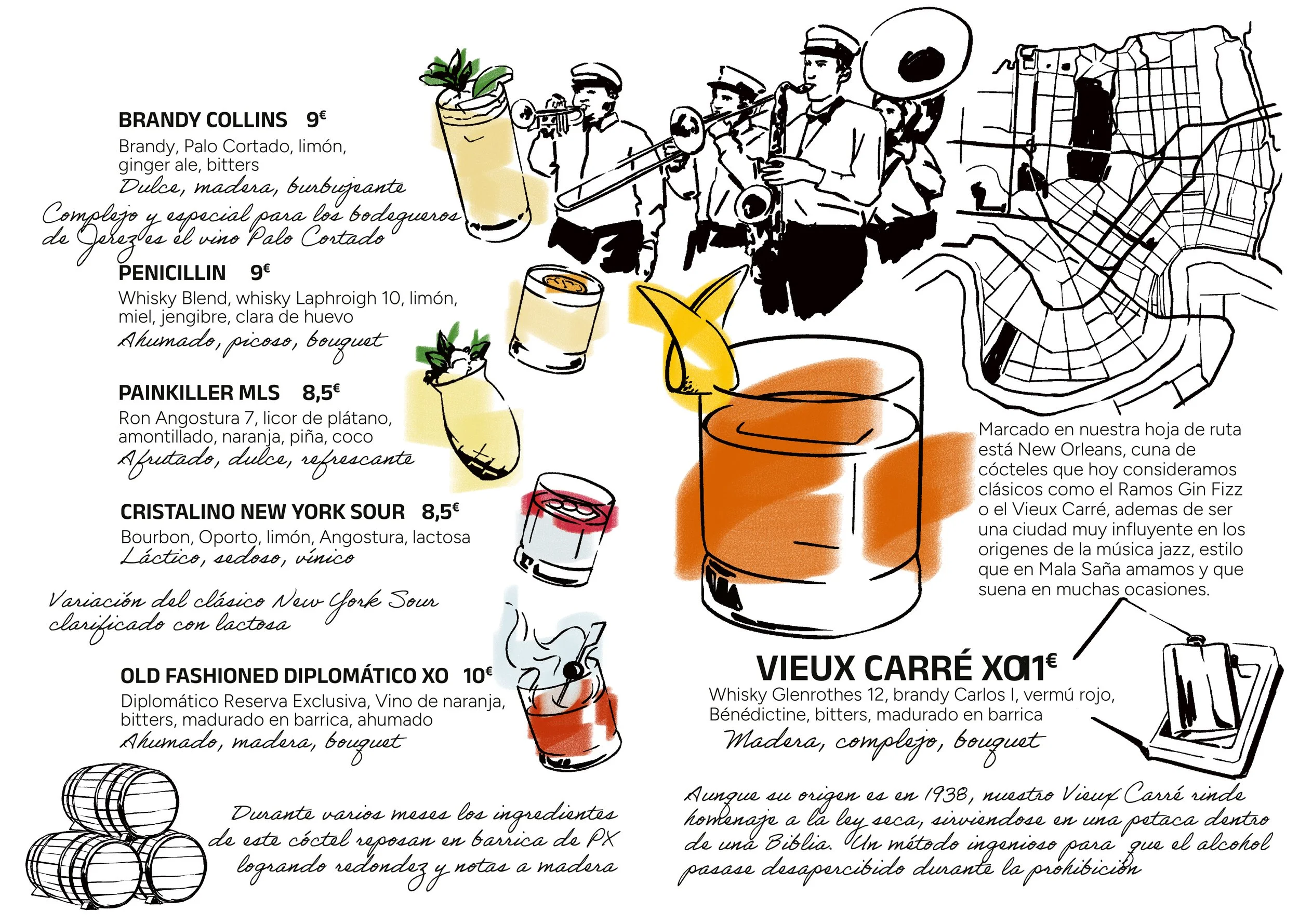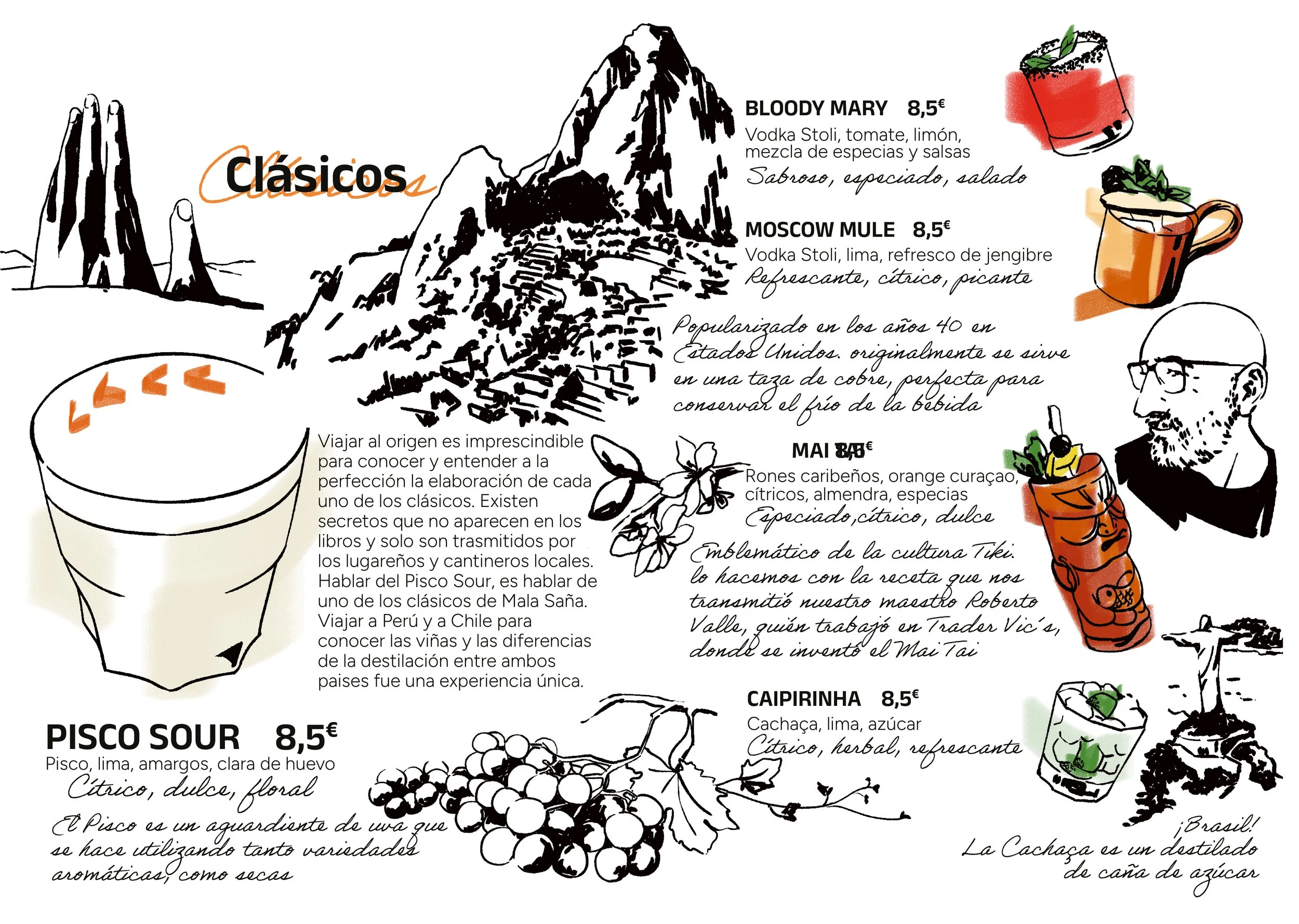 La historia de Mala Saña se cuenta en su carta, y su filosofía se expresa en cada cóctel. Las raíces que inspiran a nuestras creaciones provienen de la coctelería clásica, nuestros tragos van cambiando con cada nueva estación y con los ingredientes que la temporada nos brinda.